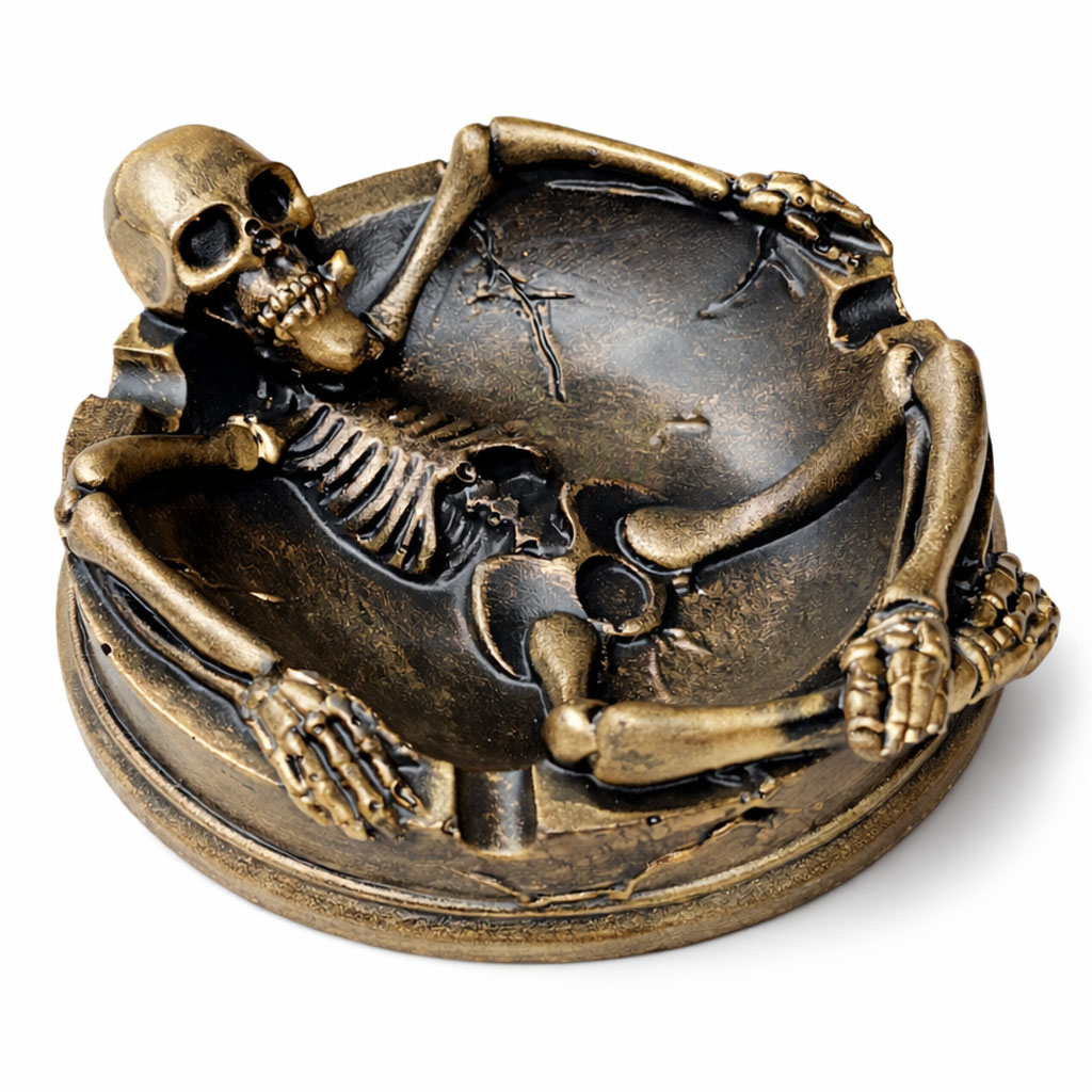 Realistycznie odwzorowane detale szkieletu, postarzana faktura oraz efekt antycznego złota nadają całości wyrazisty, lekko surowy klimat. Kościotrup nonszalancko oparty o rant misy tworzy dekorację, która zdecydowanie wyróżnia się na tle klasycznych popielniczek.