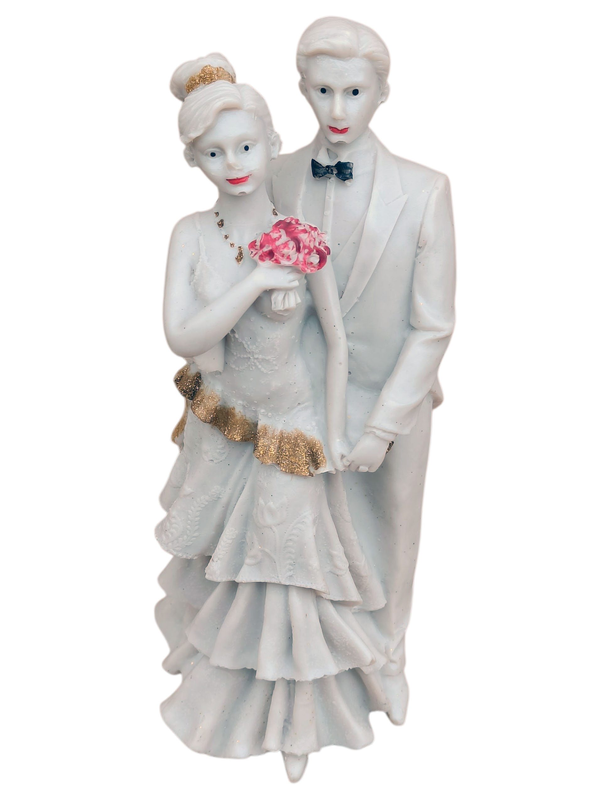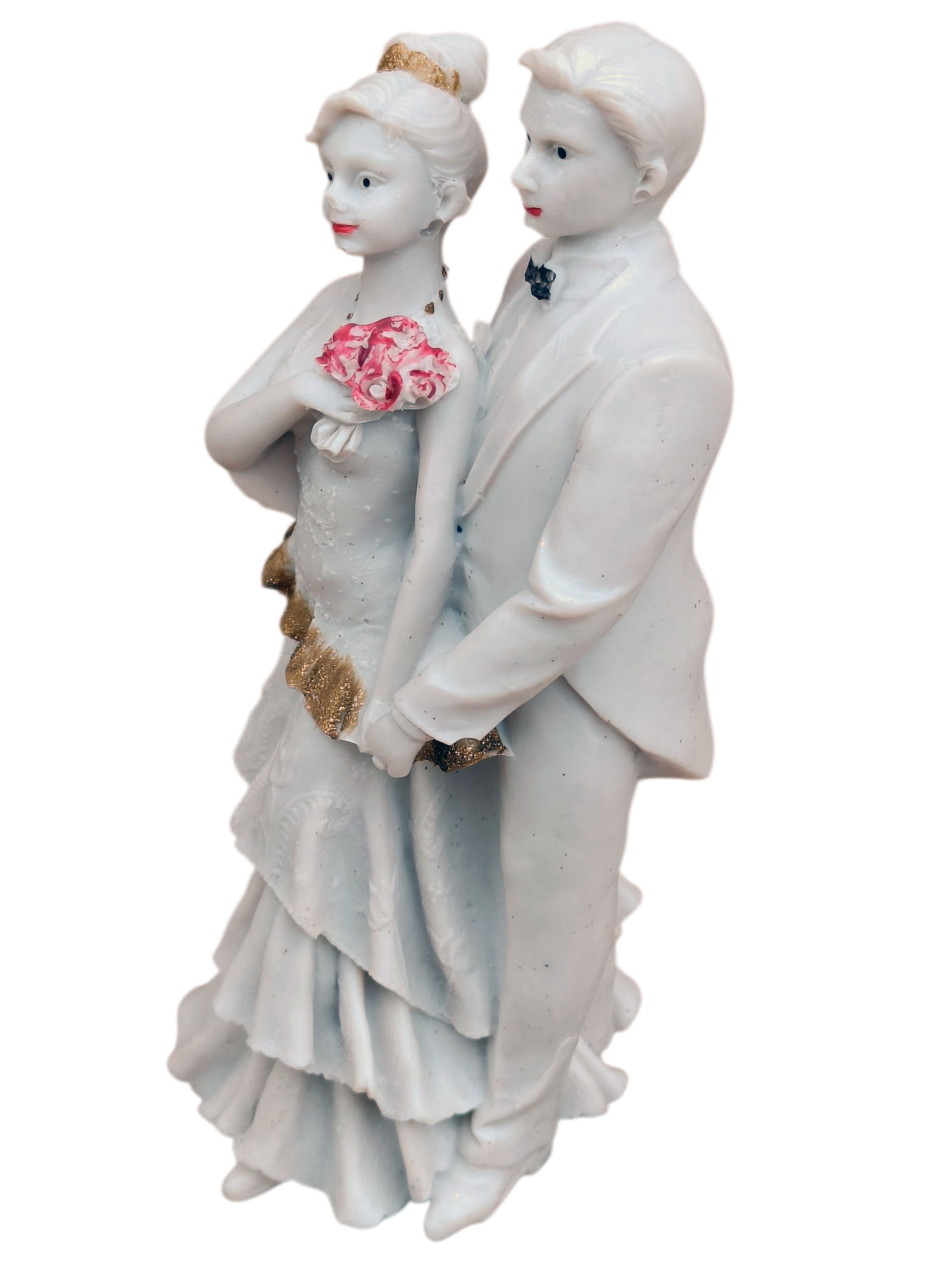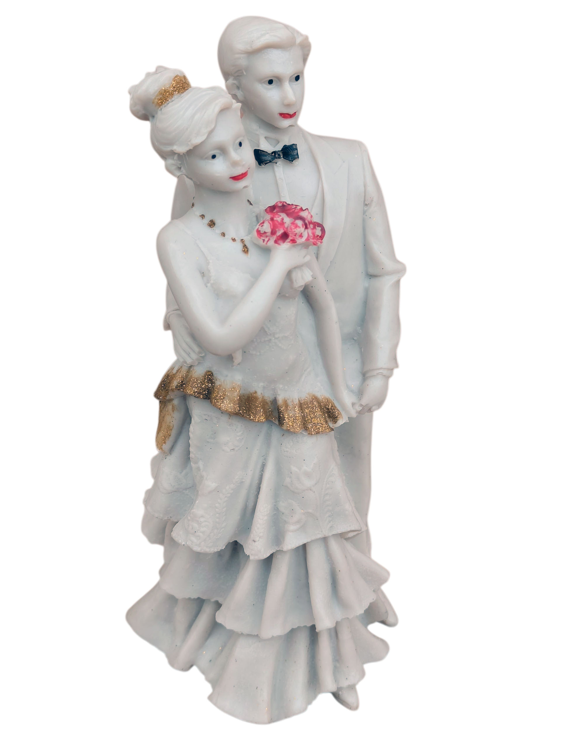 Elegancka figurka przedstawiająca parę młodą to piękny symbol miłości i wspólnej drogi. Wykonana z wysokiej jakości żywicy, zachwyca precyzyjnym odwzorowaniem detali, złotymi akcentami i subtelnym bukietem w dłoni panny młodej. Doskonale sprawdzi się jako dekoracja ślubna, pamiątka z uroczystości lub gotowy do wręczenia prezent dla nowożeńców.