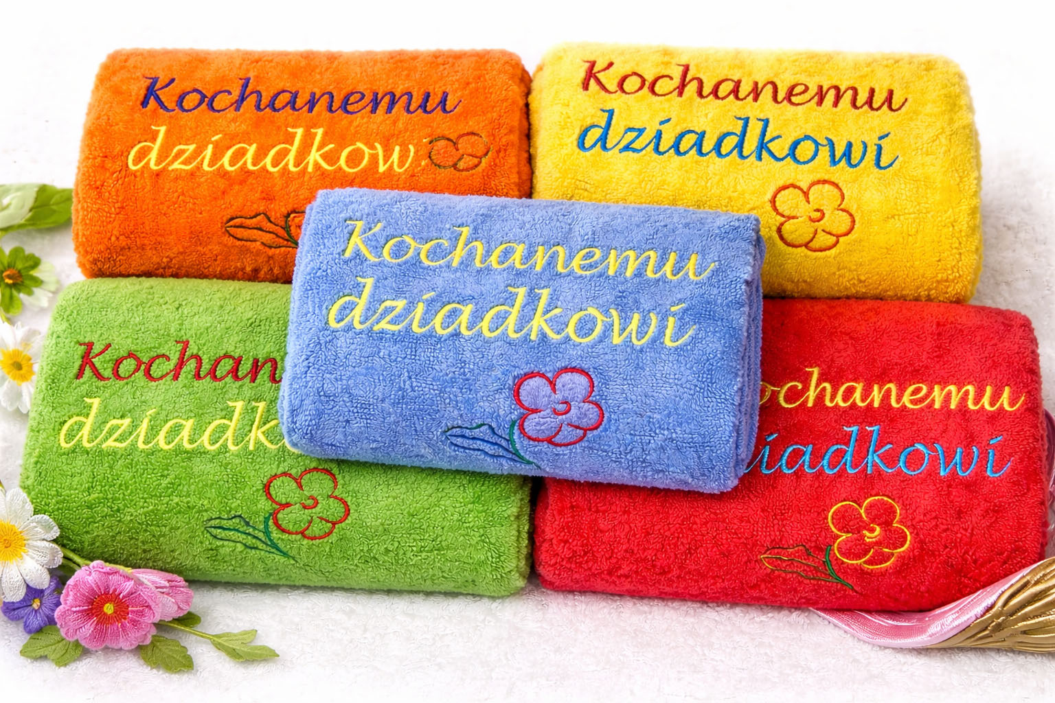 Każdy ręcznik pakowany jest w przeźroczystą folię, zawiązaną wstążką, z ozdobną karteczką na życzenia.